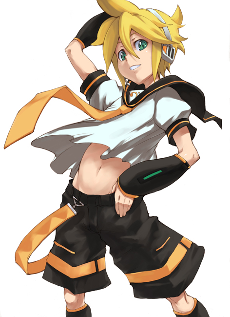 1boyblonde hairgreen eyesheadphonesheadsetmale focusmidriffnavelnecktieshort hairshortssimple backgroundsmilesoloyellow necktie