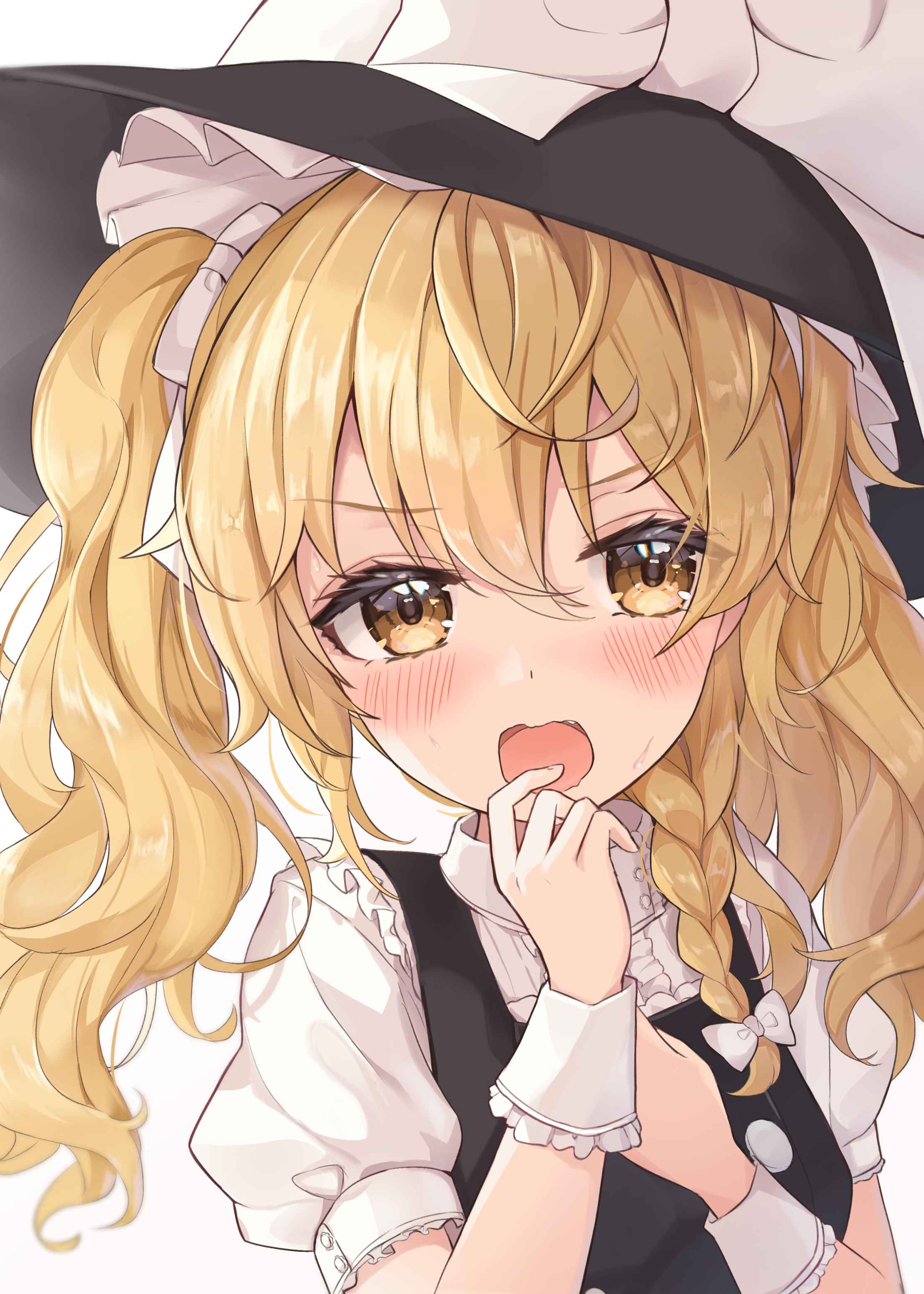 1girlalternate hairstyleblack hatblack vestblonde hairblushbowbraidhair bowhathat bowlooking at vieweropen mouthpuffy short sleevespuffy sleevesshort sleevesside braidsingle braidsolotwintailsvestwhite bowwitch hatyellow eyes