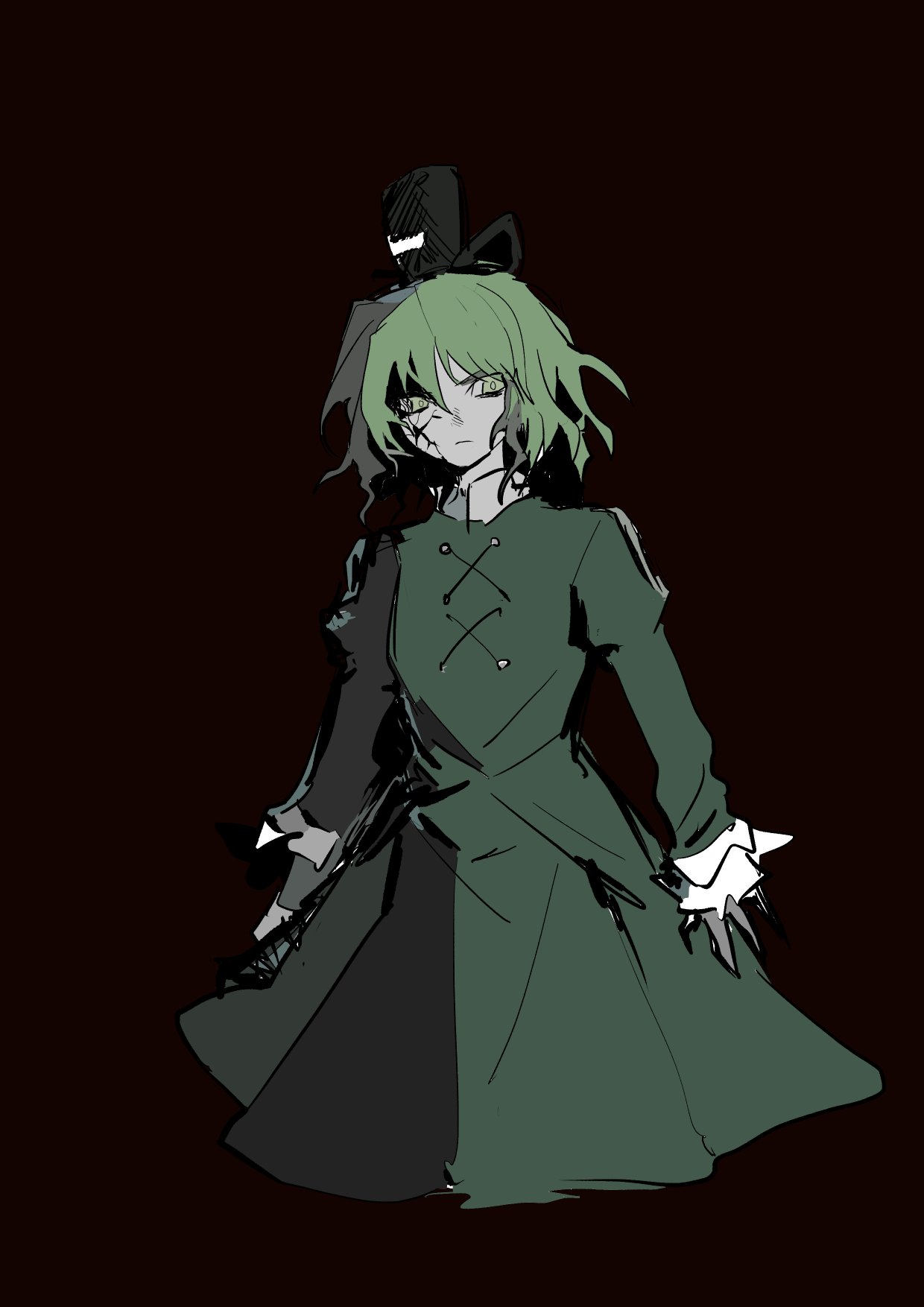 1girlblack hatblack ribbonclosed mouthcracked skincropped legscross-laced clothescross-laced dressdressexpressionlessgreen dressgreen eyesgreen hairhair between eyeshathat ribbonjuliet sleeveslong sleeveslooking at viewermedium dressofudaofuda on clothespuffy sleevesred backgroundribbonshort hairsimple backgroundsleeve cuffssleeves past wristssolostandingtate eboshius51927694