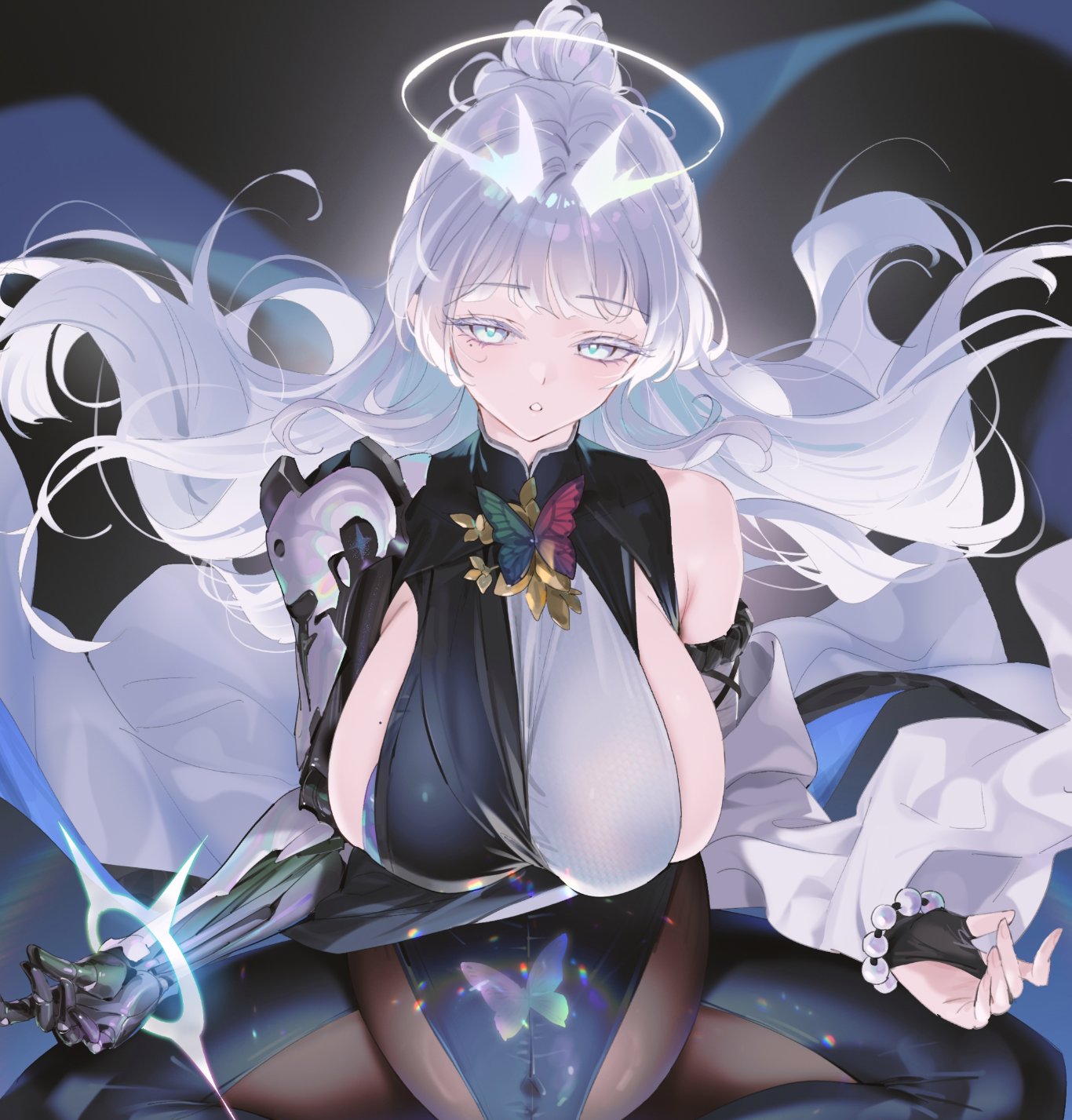 1girlbreastsclosed eyescolored eyelashesearringsgrey hairhuge breastsjewelrylarge breastslong hairlooking at viewermechanical armsmolepantyhosesideboobsingle mechanical armsolothick eyelashesvery long hairwhite eyelasheswhite hair