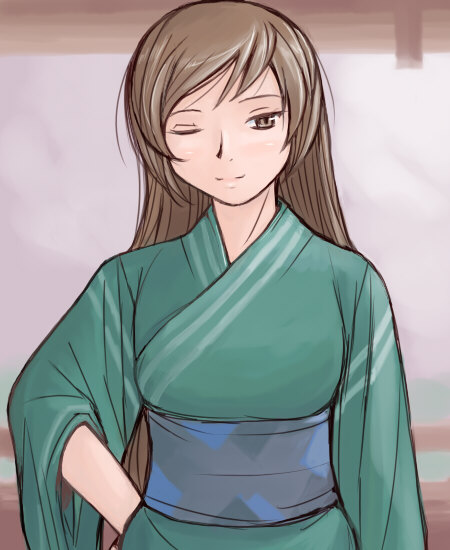 nishimata aoi, clover (game cg), striped, highres, 1girl, blue eyes, blush, breasts, brown hair, choker, cleavage, covered erect nipples, cross, dress, female focus, garter belt, gloves, hat, head tilt, long hair, nurse, nurse cap, smile, solo, test tube, thighhighs, very long hair, white thighhighs, zettai ryouiki