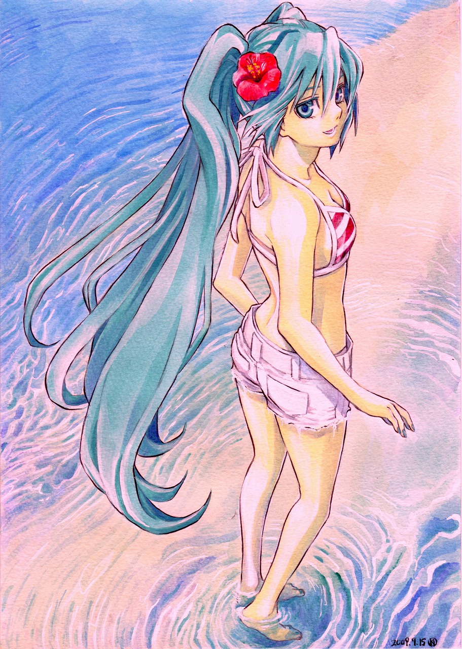 00s1girl2009aqua eyesaqua hairbarefootbikinibikini top onlydateddenimdenim shortsfemale focusflowerfull bodyhair flowerhair ornamenthibiscuslong hairlooking backripplesshortssignaturesmilesolostandingstriped bikinistriped clothesswimsuittwintailsvery long hairwadingwater