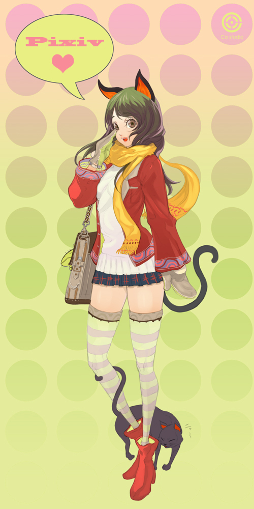 animal earsbrown eyescatcat earscat tailglovesgreen hairscarfskirtsolostriped clothesstriped thighhighstailthighhighszettai ryouiki