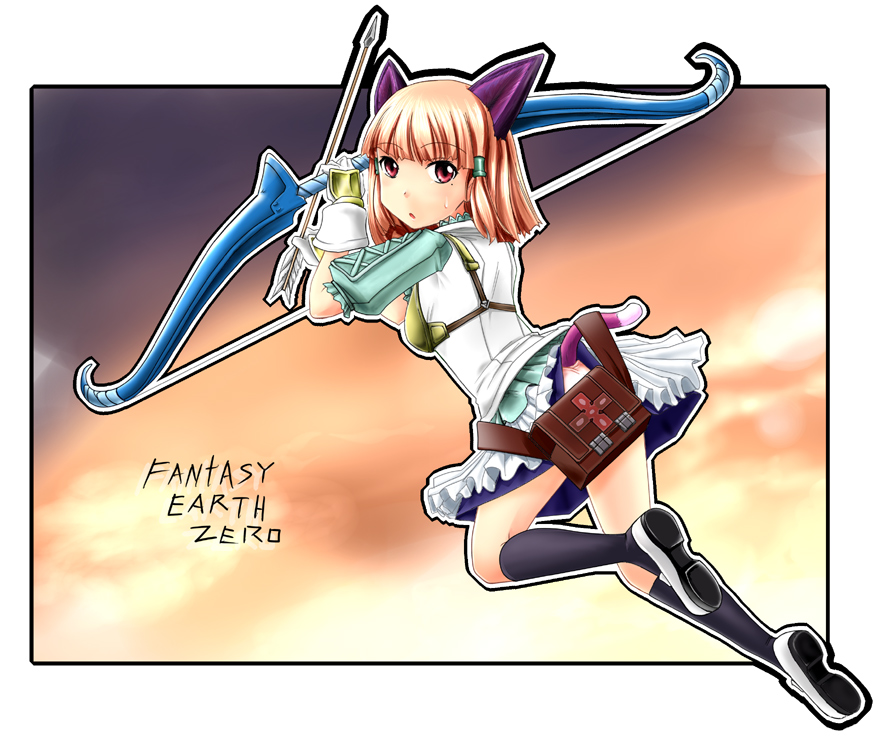 1girlanimal earsarrow (projectile)bagblonde hairbow (weapon)brown eyesbrown haircat earscat tailcloudfemale focusfirst aidfirst aid kitgloveskneehighslooking backmolemole under eyepantiespantyshotred eyessatchelskirtsockssolotailunderwearweapon