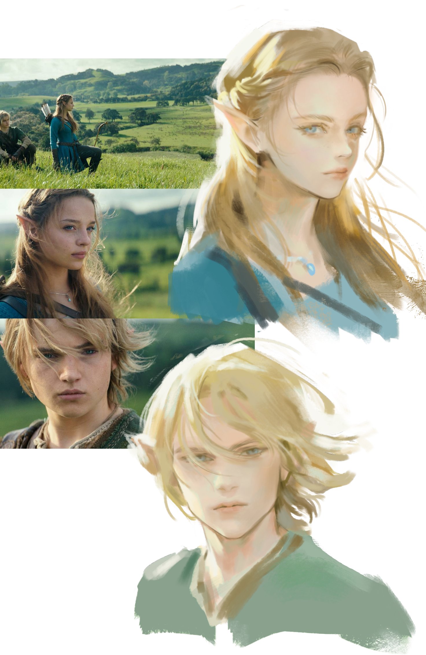 1boy1girlarrow (projectile)blonde hairblue shirtbow (weapon)closed mouthdaygreen shirtinog-eunjewelrylong hairlooking at viewernecklaceoutdoorsparted bangspointy earsquivershirtshort hairsmileweapon