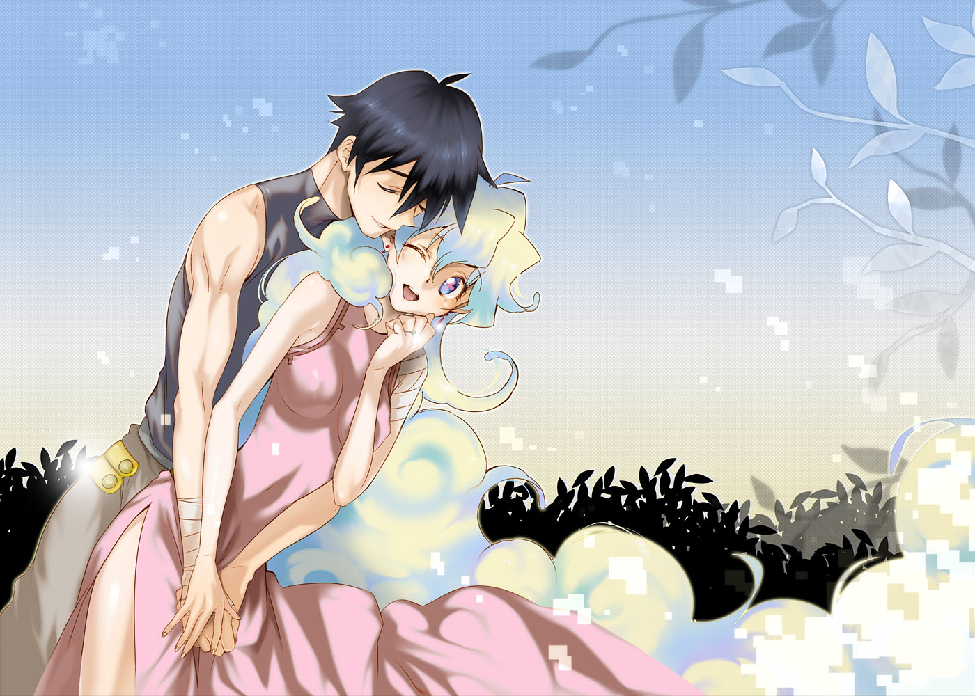 00s1boy1girlbare shouldersblack haircoupledressearringsheterohughug from behindjewelrylong hairmulticolored hairone eye closedpink dresssleevelesssmilevery long hairwink