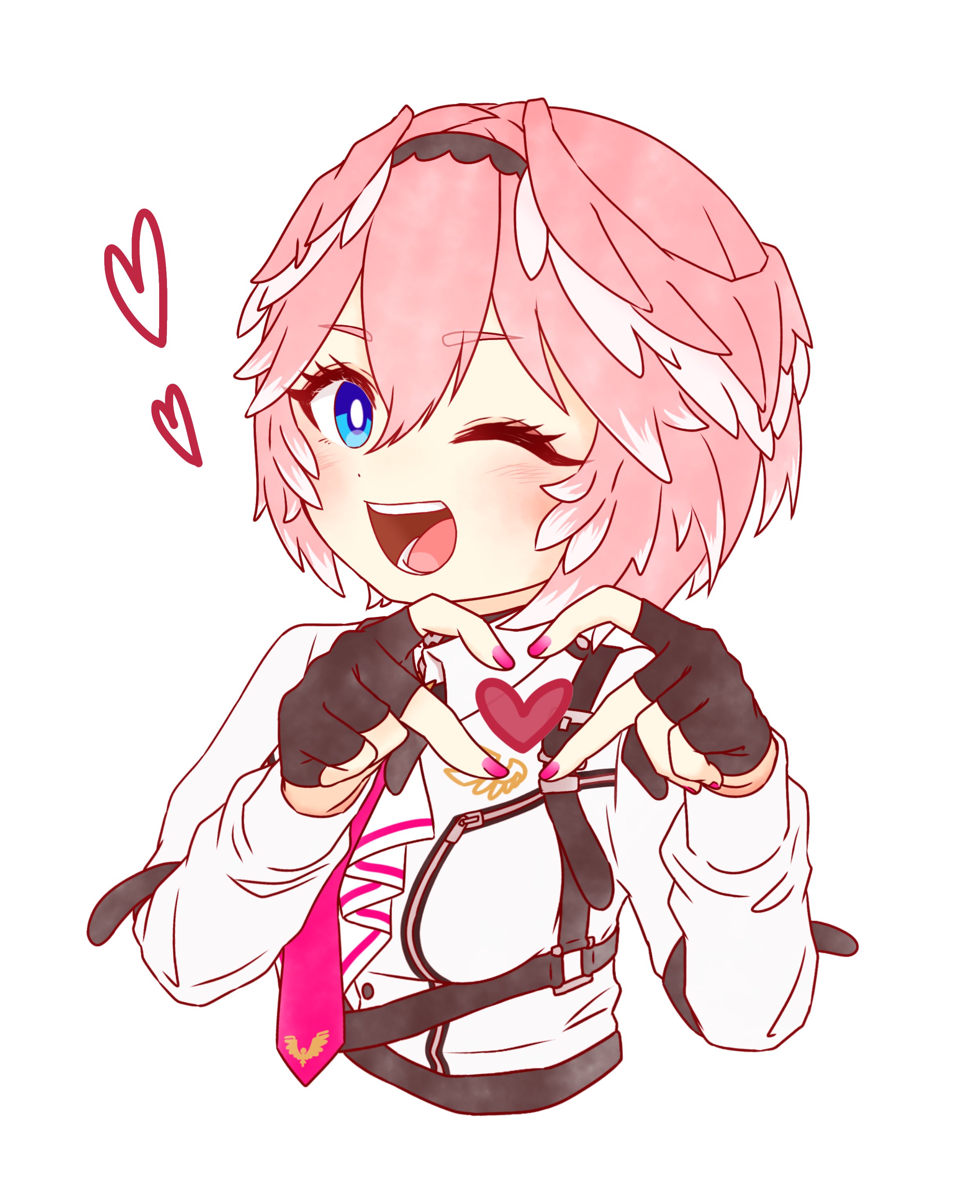 1girlblack glovesblue eyesbreast zipperbreastscropped torsodouble-parted bangsfingerless glovesfingernailsfour-finger heart handsgloveshair between eyeshead wingsheartheart handsheart in heart handslong sleeveslooking at viewernail polishnecktieone eye closedopen mouthpink hairpink nailspink necktieshirtshort hairsimple backgroundsmilesolovirtual youtuberwhite backgroundwhite shirtwingszipperzipper pull tab