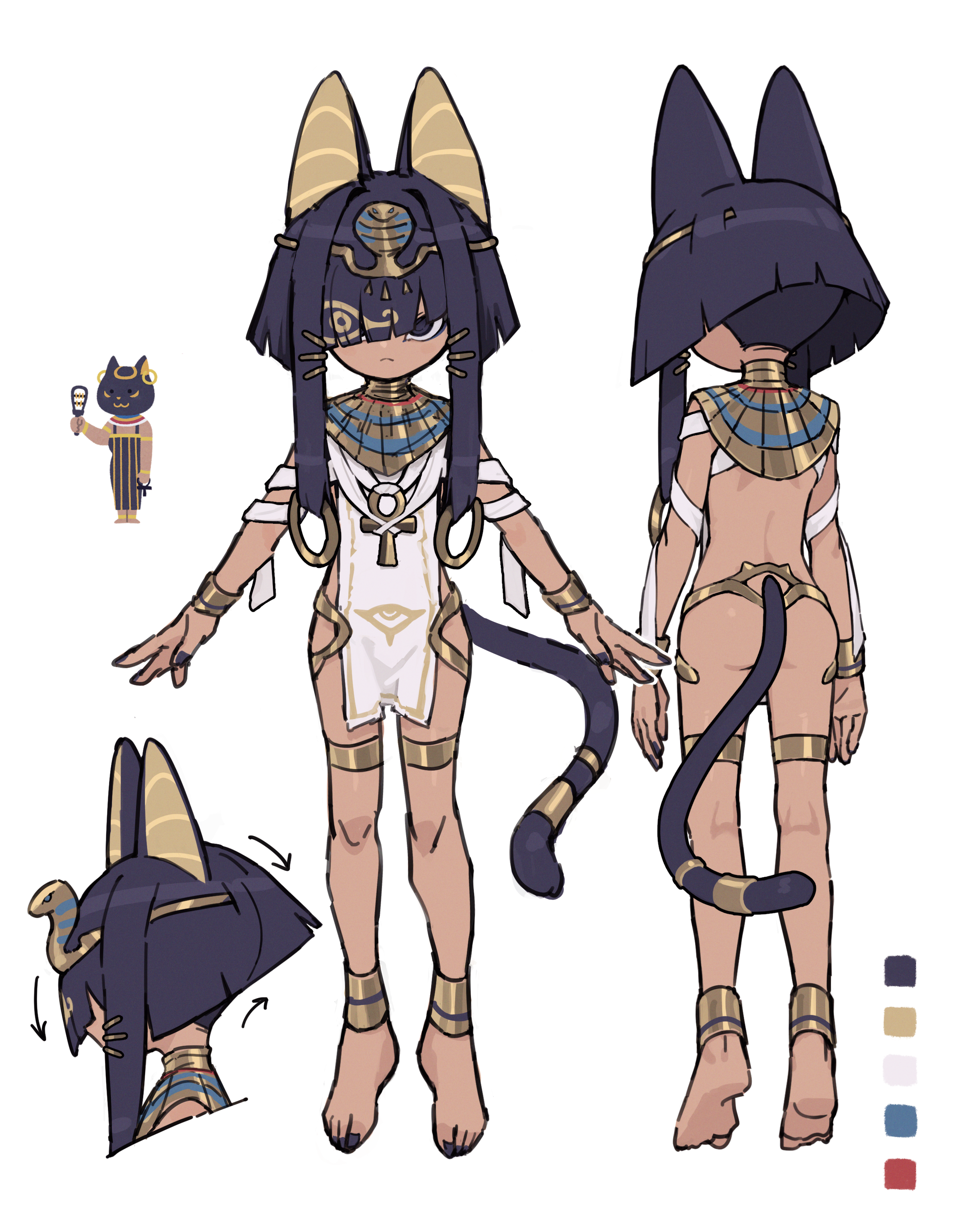 1girlancient egyptianancient egyptian clothesanimal earsankletblack eyesblack furblack hairblack nailsbraceletbrown egyptian cat-eared loli (trend)cat earscat girlcat tailclosed mouthdark skindark-skinned femalefull bodyhair over one eyejewelrylong hairlooking at viewerreference sheetsidelockssimple backgroundtailtanusekh collarwhite background