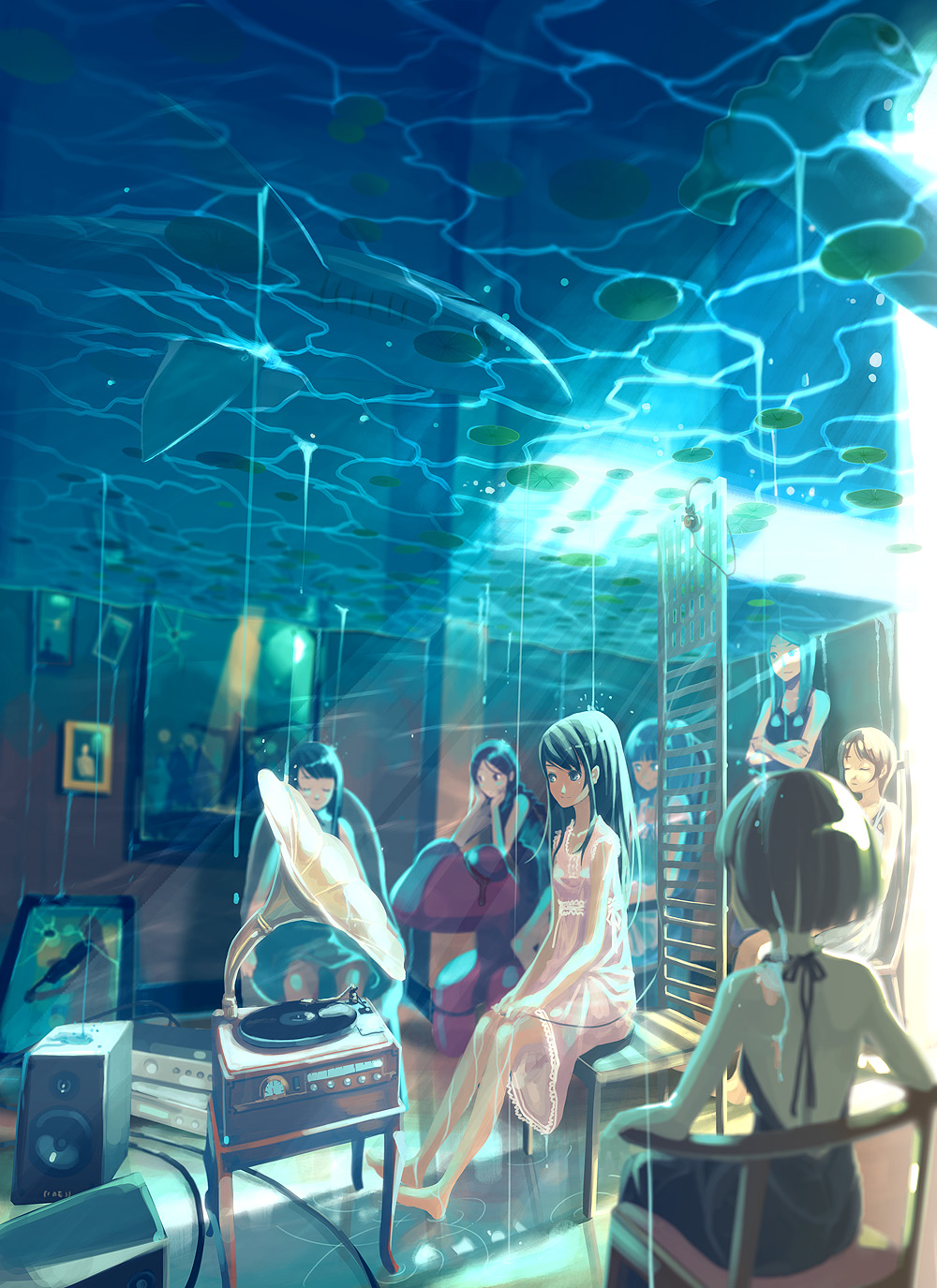 6+girlsamplifierblue haircausticschairclosed eyescrossed armsdressfishformal clotheshalterneckhammerhead sharkheadphonesinstrumentlight rayslily padmultiple girlsnightgownpainting (object)phonographsharksittingspeakersunbeamsunlightsurrealunderwaterviolinwater