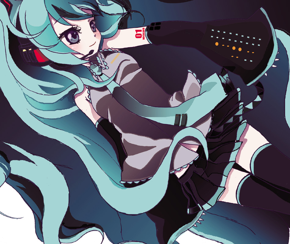 1girlaqua eyesaqua hairdetached sleevesfemale focusheadphonesheadsetlong hairnecktieskirtsmilesolothighhighstwintailsvery long hairzettai ryouiki