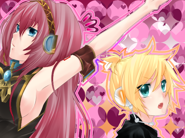 1boy1girlaqua eyesarmpitsblonde hairblue eyesbreastsheadphonesheadsetlarge breastslong hairpink hairshort hairsideboob