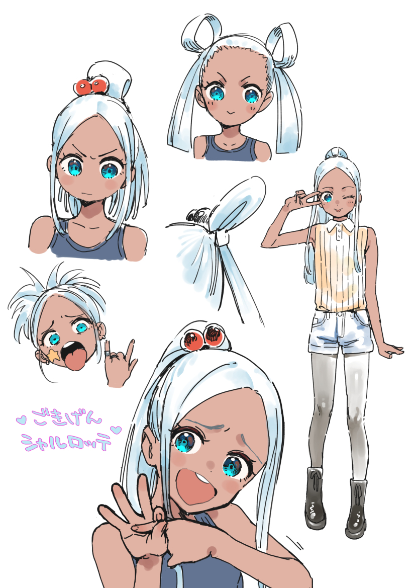 1boy1girlblue eyesbootsclosed mouthdark skindark-skinned femaledenimdenim shortsflat chesthair ringslong hairlooking at viewermultiple viewsone eye closedopen mouthpantyhosepenetration gestureponytailschool swimsuitshortssketchsmileswimsuittantonguetongue outtwintailsvwhite hair