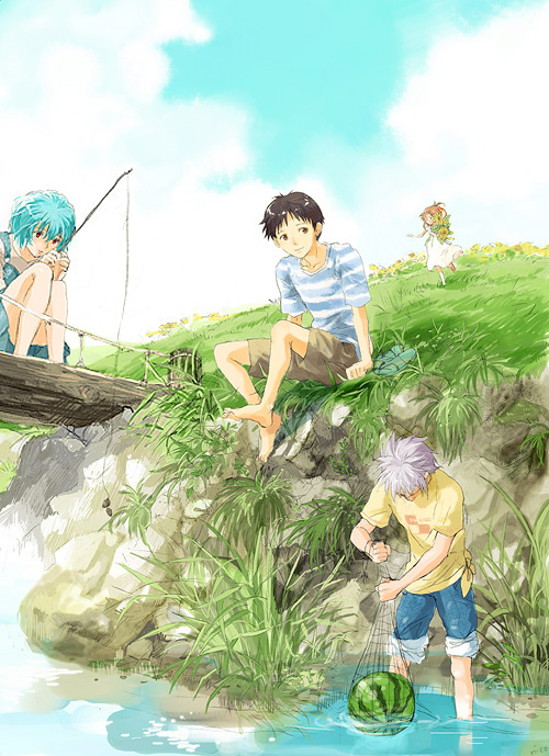 2boys2girlsarms at sidesbarefootblack hairblouseblue hairblue shirtclouddaydressfishingfishing netfishing rodfoodfruitgrassmultiple boysmultiple girlsnetoutdoorsprint shirtred eyesrunningshirtshortssittingskyslice of lifestandingwadingwatermelonwhite shirtyellow shirt