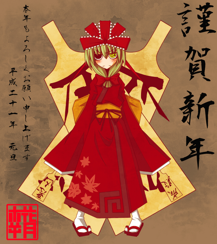 1girlblack eyesfemale focusfull bodygreen eyesgreen hairhair ribbonheterochromiajapanese clotheskimonomatching hair/eyesribbonsandalsshort hairsolo
