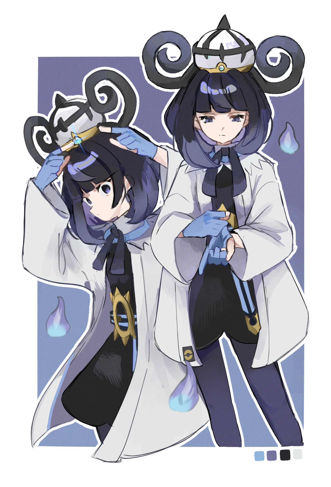 1girlbeltbelt buckleblack dressblack hairblue glovesblunt bangsbuckleclosed mouthcoatdressfiregloveshatlooking at viewermultiple viewso-ringo-ring beltopen clothesopen coatoutlinepantyhosepartially fingerless glovespurple eyespurple fireshort hairwhite coatwhite outline