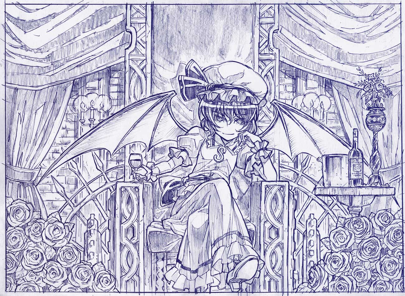 1girlalcoholbat wingsbottlecupdrinking glassfemale focusflowerhatmonochromeroseshort hairsittingsolothronewinewine glasswings