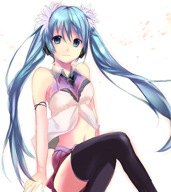 1girlartistic errorblue eyesblue haircasualcrossed legsfemale focusheadphoneslong hairmatching hair/eyesmidriffnavelnecktiesittingskirtsolothighhighstwintailswhite backgroundzettai ryouiki