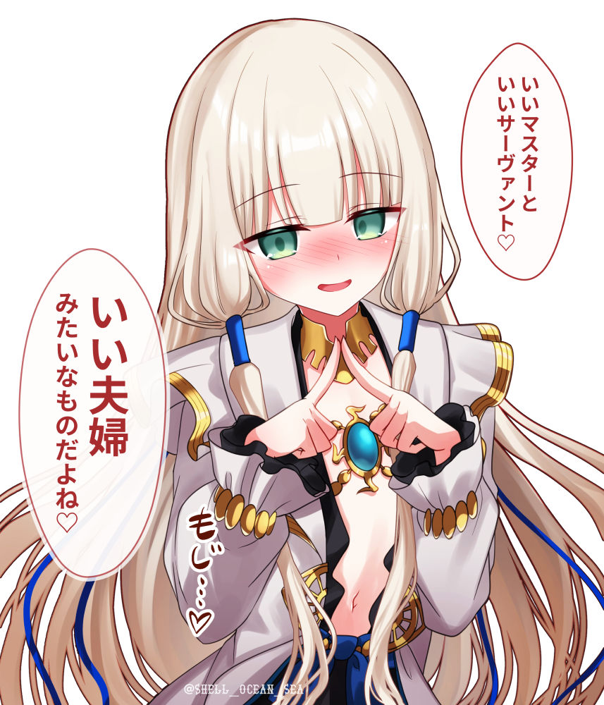 1boyblack robeblushbroochgold trimgreen eyesjewelrylong hairlong sleeveslooking at viewernavelneck ringopen mouthrobesmilesolospeech bubblevery long hairwhite hairwhite robe