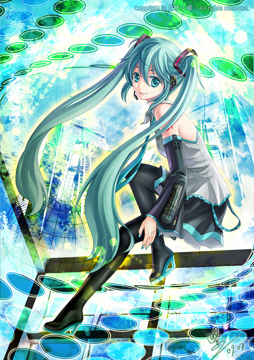 1girlaqua eyesaqua hairdetached sleevesfemale focushair between eyesheadphonesheadsetlong hairnecktiesmilesolospring onionthighhighstwintails