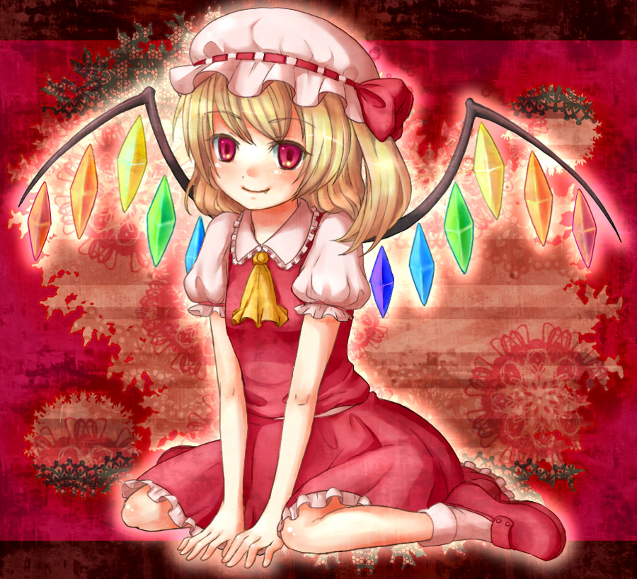 1girlblonde hairfangfemale focusfull bodyhatone side upponytailred eyesshort hairside ponytailsittingsolowings