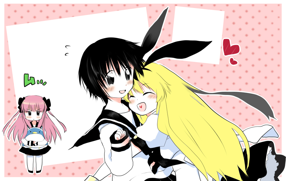 00s3girlsblack eyesblack hairblonde hairblushchibihappyhearthuglong hairmultiple girlsopen mouthpink hairschool uniformshort hairthighhighswhite thighhighs