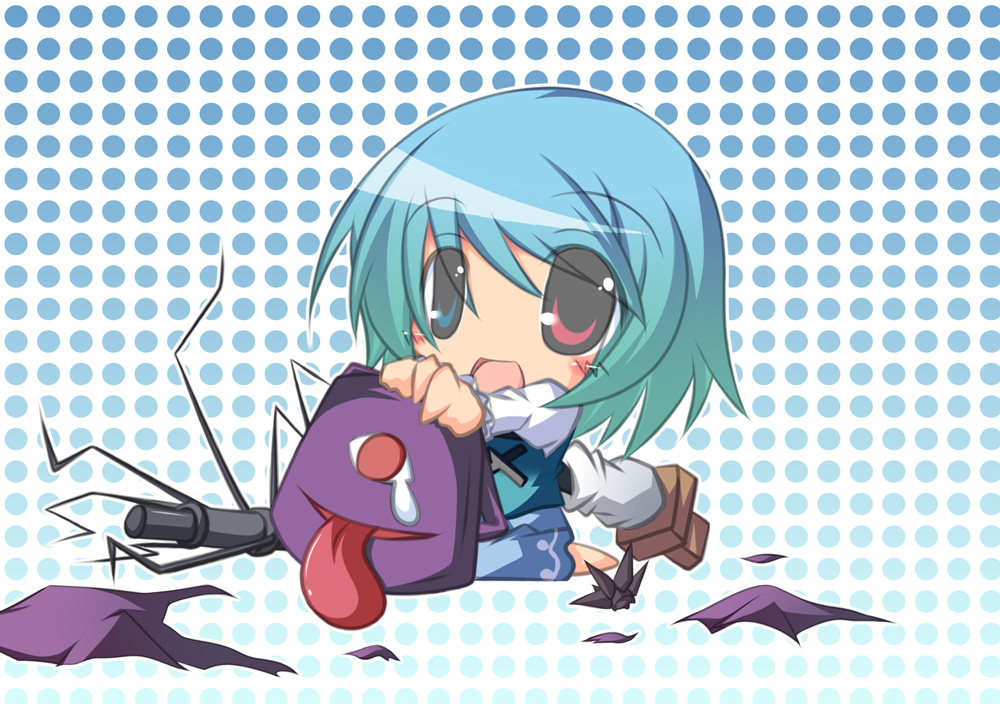 1girlaqua hairblue eyeschibifemale focusgetaheterochromiakarakasa obakered eyessandalssolotearstongueumbrella