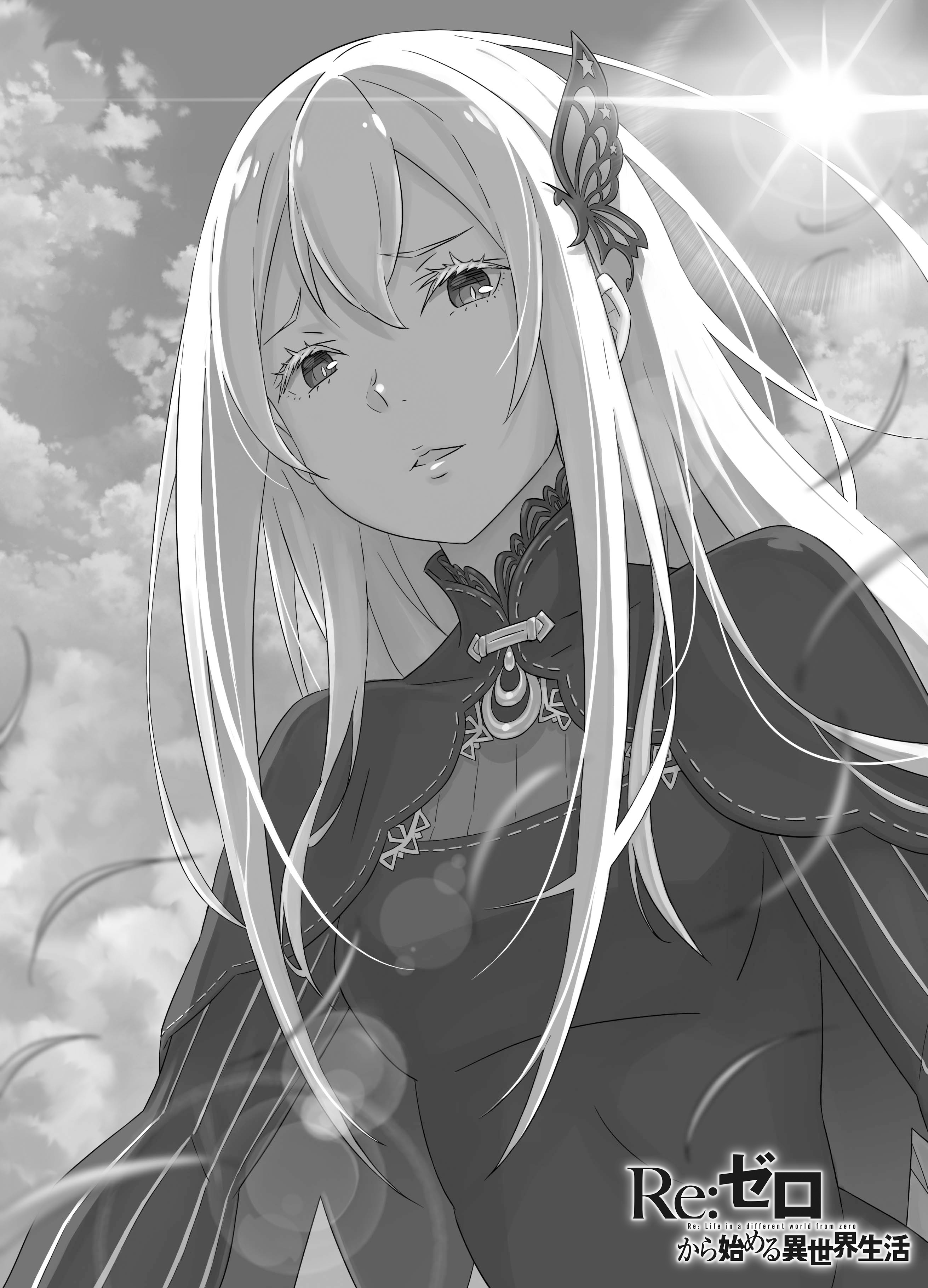 1girlblurrybreastsbutterfly hair ornamentcapeletcloudcollared capeletcopyright namedressfrom belowgrey hairhair between eyeshair ornamentleaflipslong hairlong sidelockslong sleeveslooking at viewermedium breastsmonochromeparted lipsraised inner eyebrowssidelocksskysolostandingstraight hairsuntitleupper bodyvery long hair