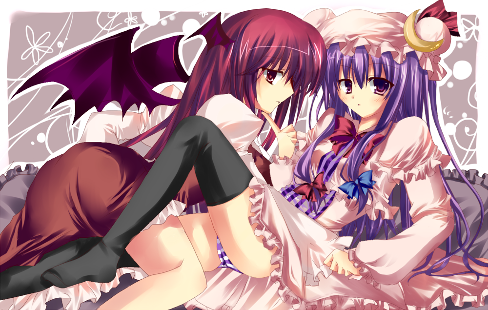2girlsbat wingsblushfemale focushair ribbonhathead wingsmultiple girlspantiespurple eyespurple hairred eyesred hairribbonsocksthighhighsunderwearwings
