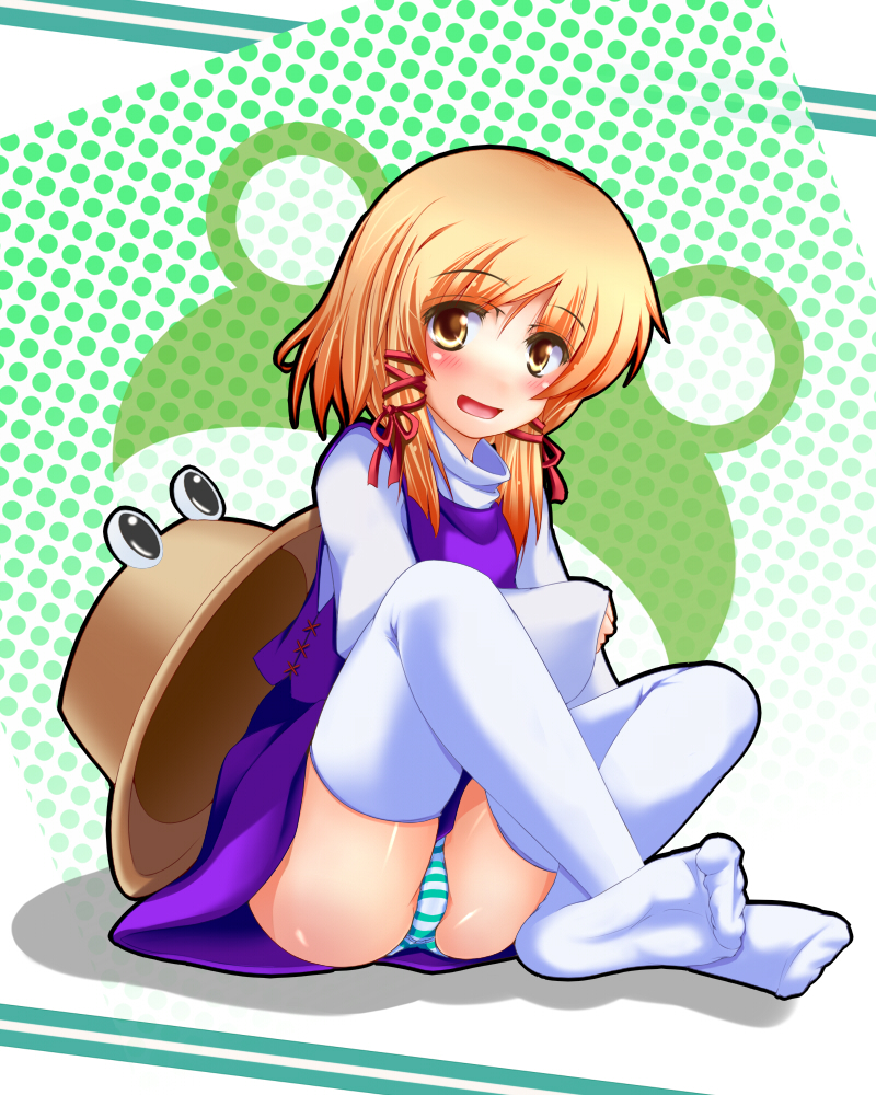 1girlblonde hairfeetfemale focushair ribbonhatpantiespantyshotribbonshort hairsittingsolostriped clothesstriped pantiesthighhighsunderwearwhite thighhighsyellow eyes