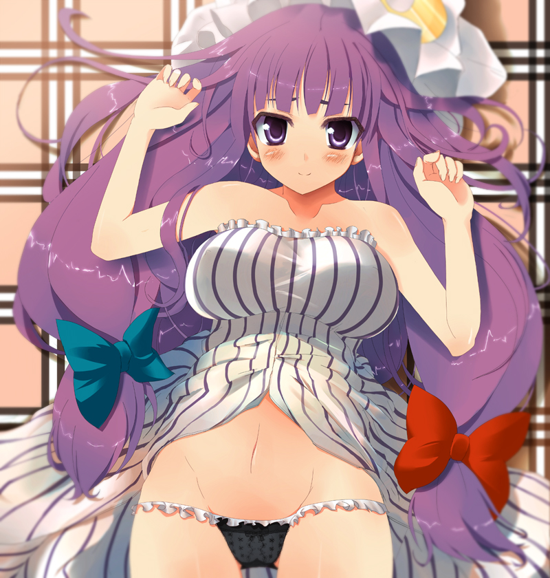 1girlbare shouldersblack pantiesblurryblushbowbreastscurvydepth of fielddressfemale focusfrilled pantiesfrillsgroinhair bowhatlarge breastslong hairlooking at viewerlowleglowleg pantieslyingmidriffnavelon backpantiespurple eyespurple hairsmilesolounderwearvery long hair