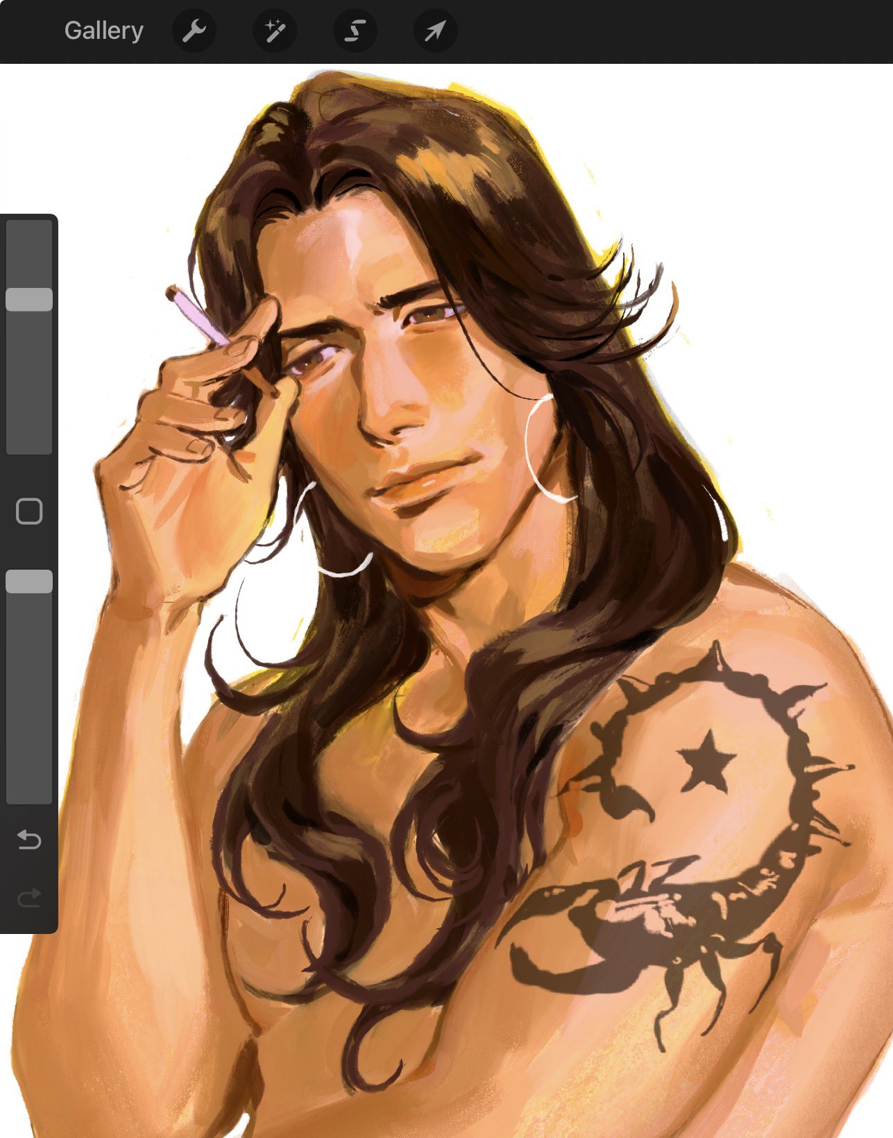 1boyarm tattooart program in frameaston (kunnuscumnus)brown eyesbrown hairclosed mouthcurtained hairearringselbow resthair over breastsholdinghoop earringsjewelrylong hairlooking to the sideparted bangsparted hairprocreate (software)scorpion tattoosilver earringsstar (symbol)star tattootattooupper bodywavy hairwhite background