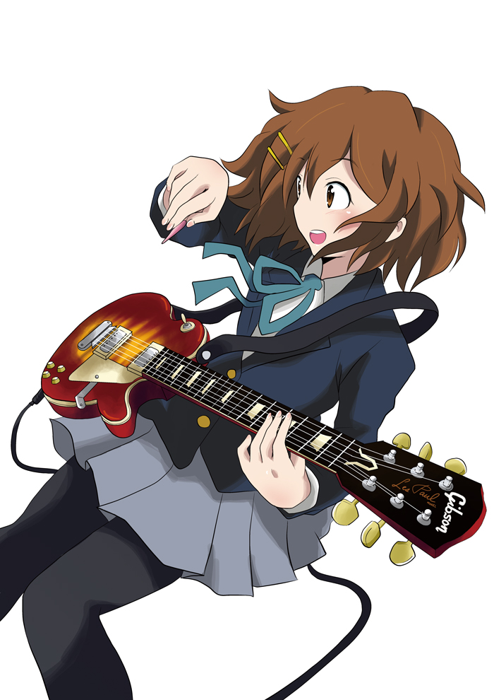 00s1girlbrown eyesbrown hairelectric guitarfemale focusgibson les paulguitarinstrumentpantyhoseschool uniformshort hairsimple backgroundsolowhite background