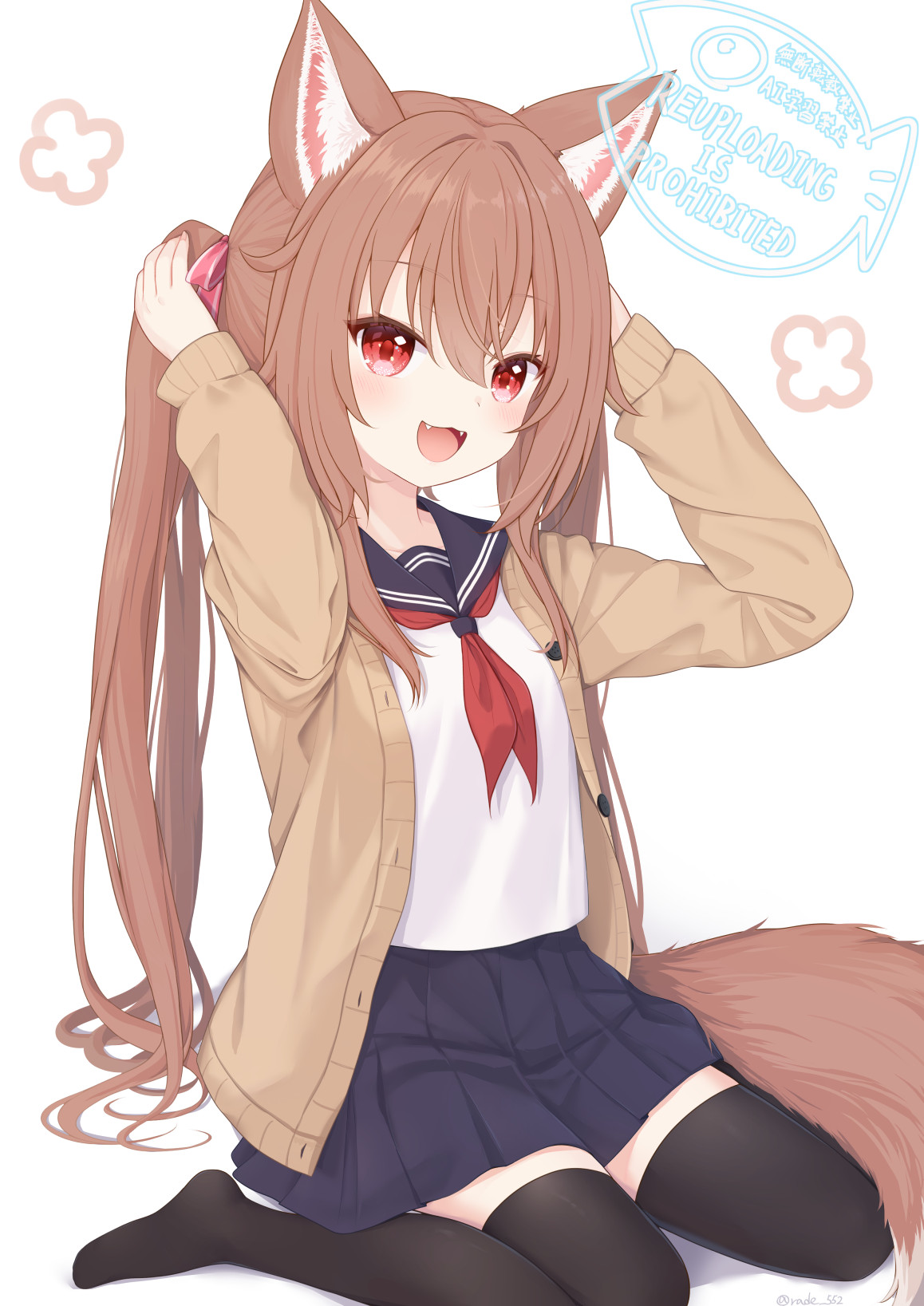 1girlanimal earsblack thighhighsbrown haircardiganlong hairneckerchiefopen cardiganopen clothespleated skirtred eyesred neckerchiefsailor collarschool uniformserafukusittingskirtsmilesolotailthighhighstwintailswolf earswolf girlwolf tail