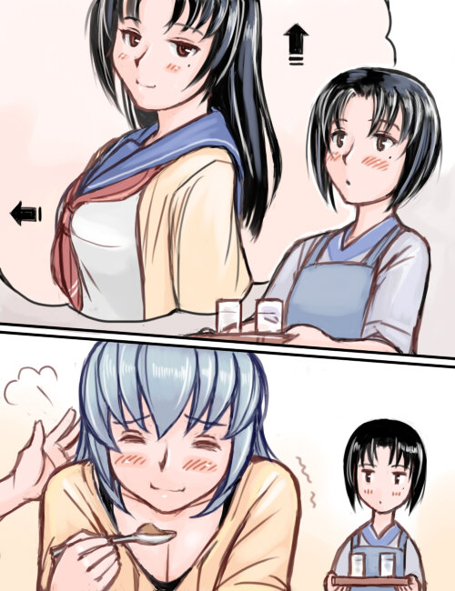 00s3girlsaged upblack hairblue sailor collarcasualeatingimagininglong hairmolemole under eyemultiple girlssailor collarshort hair