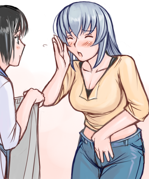 00s2girlsaged upblack hairblushbreastscasualcleavageclosed eyesdenimjeanslarge breastsmidriffmultiple girlspantsshort hair