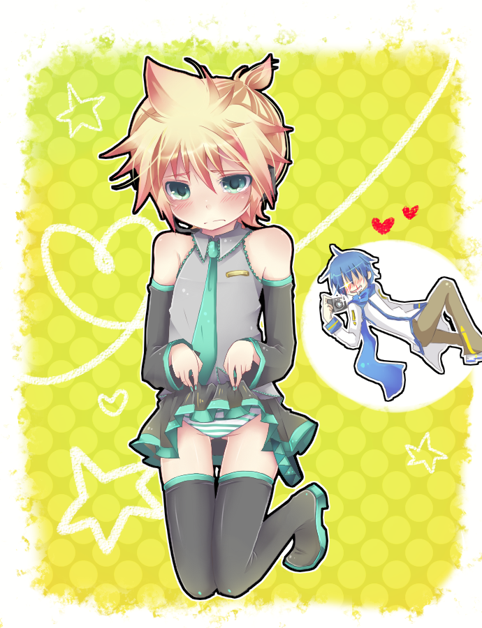 2boysaqua eyesblonde hairbloodblue hairblushcameraclothes liftcosplaycrossdressingcrossdressing (mtf)detached sleeveshatsune miku (cosplay)heartmale focusmultiple boysnecktienosebleedpantiessalivashort hairskirtskirt liftsmilestriped clothesstriped pantiestearsthighhighstrapunderwear