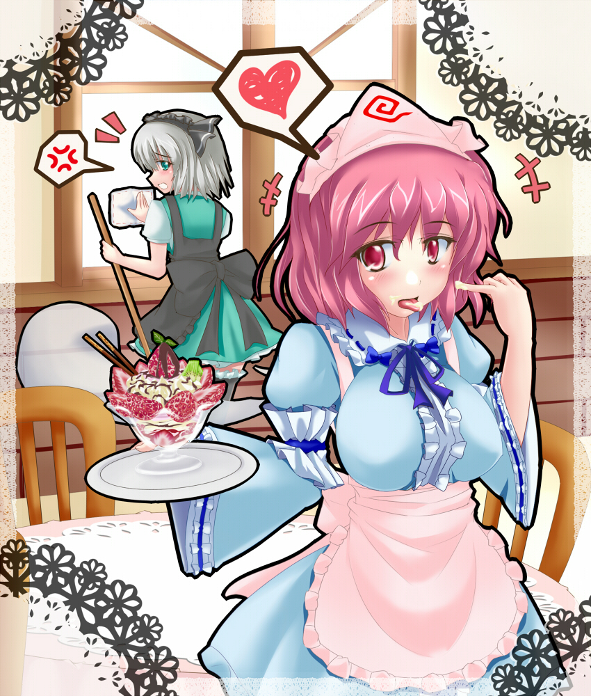 2girlsanger veinapronaqua hairbroomfemale focusfoodghosthairbandheartice creammaid headdressmultiple girlspink eyespink hairshort hairspoken heart