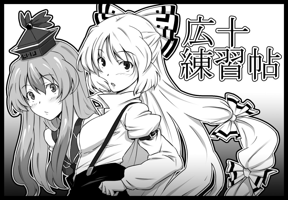 1boy2girlsblushbowfemale focusgreyscalehair bowhatleaning forwardlong hairmonochromemultiple girlsstaringsuspenders