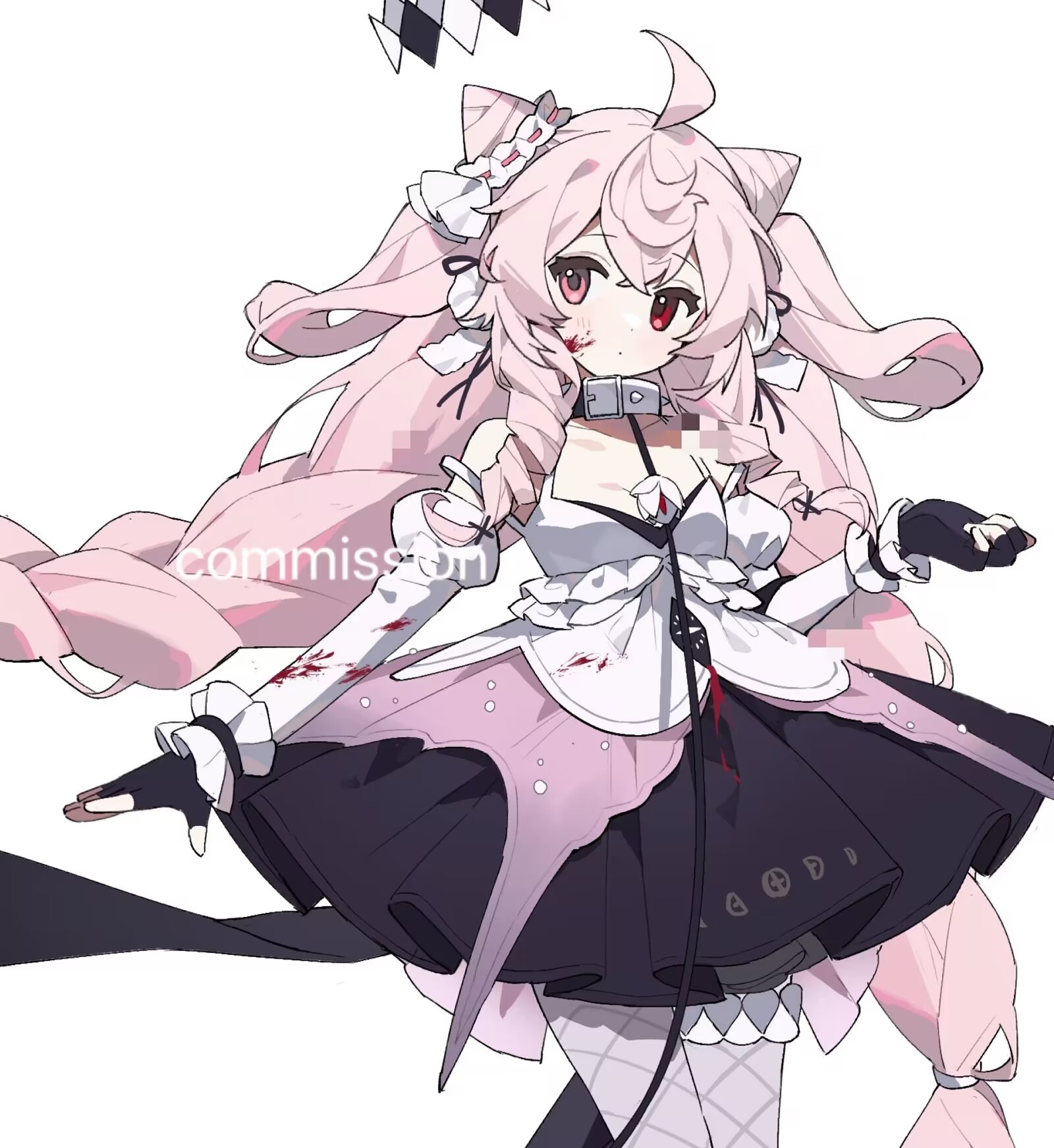 1girlahogebare shouldersblack glovesblack skirtbloodblood on clothesblood on faceblushclosed mouthcollarcone hair buncowboy shotdouble bundouble-parted bangsfingerless glovesfishnet pantyhosefishnetsglovesgrey pantyhosehair between eyeshair bunhand upheterochromiajuliet sleeveslong hairlong sleeveslooking at viewerorange eyespantyhosepink hairpleated skirtpuffy sleevesred eyesshirtsimple backgroundskirtsleevelesssleeveless shirtsolospiked collarspikestwo side upwhite backgroundwhite collarwhite shirt