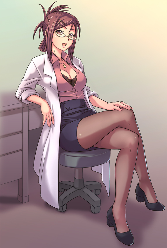 1girlbrabreastsbrown hairchaircleavagecrossed legsdoctorfemale focusglasseslab coatlegslingeriepantyhosepencil skirtsittingskirtsleeves rolled upsoloswivel chairunderwear