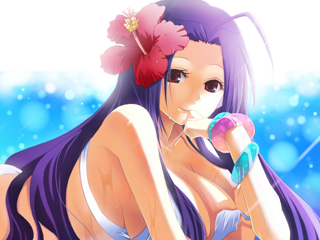 00s1girlahogebanglebare shouldersbikinibraceletbreastscleavagefemale focusfinger to mouthflowerhair flowerhair ornamenthibiscushuge breastsjewelrylarge breastslight rayslong hairpurple hairred eyessmilesolosparklestrap slipsunbeamsunlightswimsuittransparentwet