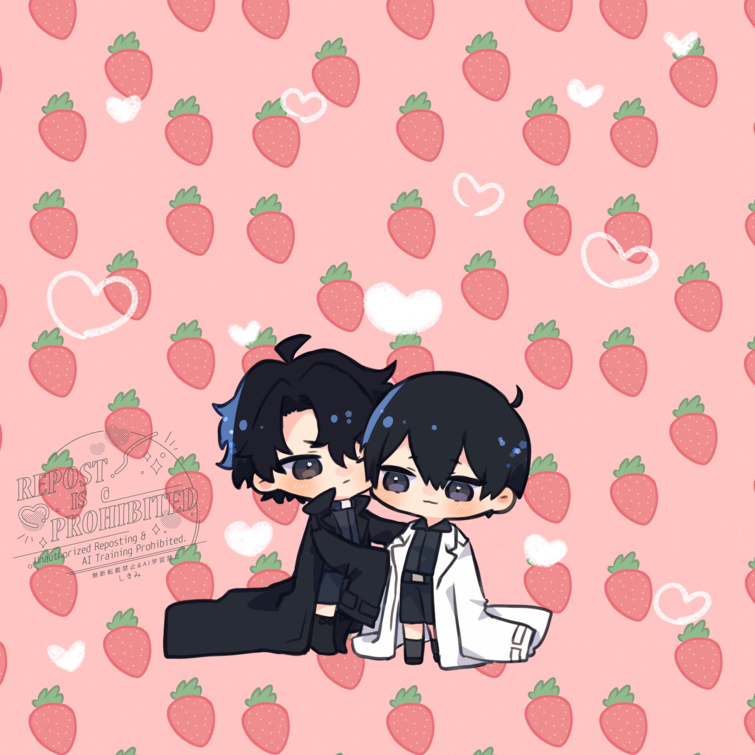 2boysahogeblack coatblack hairblack shirtcoatcollared shirtcurtained hairdouble-parted bangsfoodfruithair between eyesheartkimidori 22looking at anothermale focusmultiple boysopen clothesopen coatoversized clothespopped collarreachingreaching towards anothershirtshort hairstrawberrywhite coat