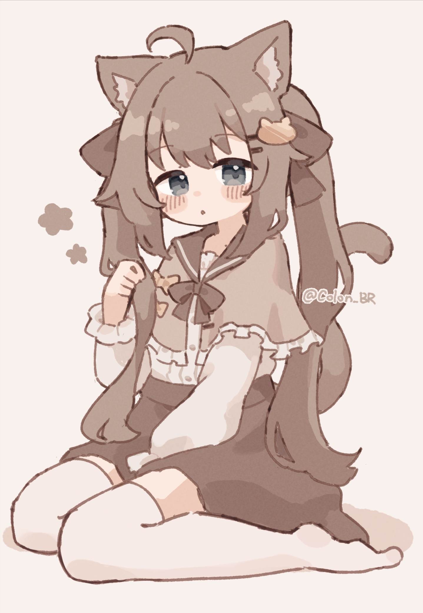 1girlahogeanimal ear fluffanimal earsblack skirtblue eyesblush stickersbrown haircapeletcat earscat girlcat hair ornamentcat tailcenter frillsfrilled capeletfrillsfull bodygrey capelethair ornamenthand uplong hairlong sleeveslooking at viewerno shoesparted lipsshirtsimple backgroundsittingskirtsolotailthighhighstwintailstwitter usernamewhite backgroundwhite shirtwhite thighhighs