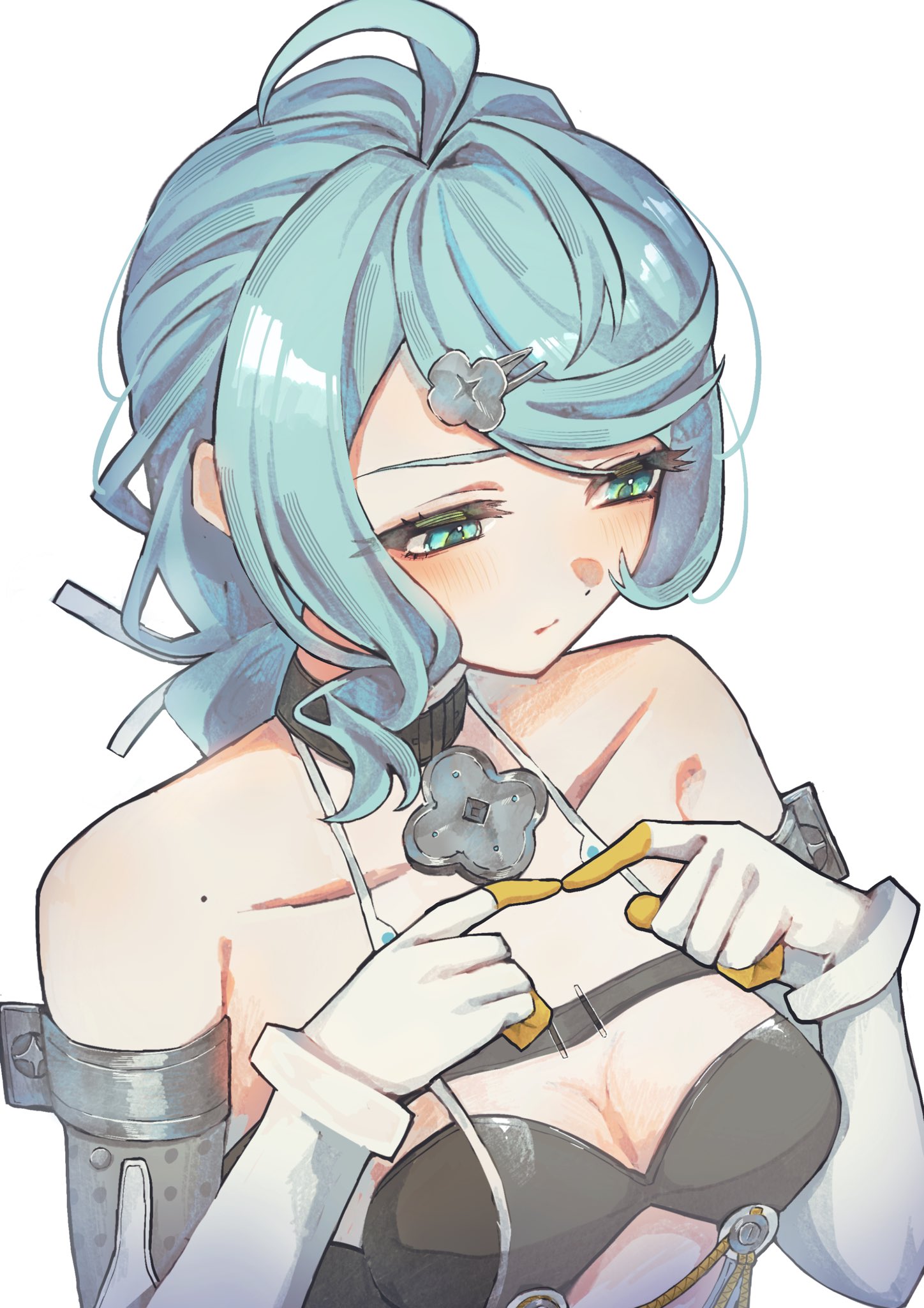 1girlbare shouldersblue eyesblue hairbraidbraided ponytailbreastsclosed mouthcollarbonedetached sleevesflower hairpingloveshair ornamenthairpinhalf-closed eyesindex fingers togethermedium breastsmolemole on shouldersee-through dress layersimple backgroundsoloupper bodywhite backgroundwhite gloves