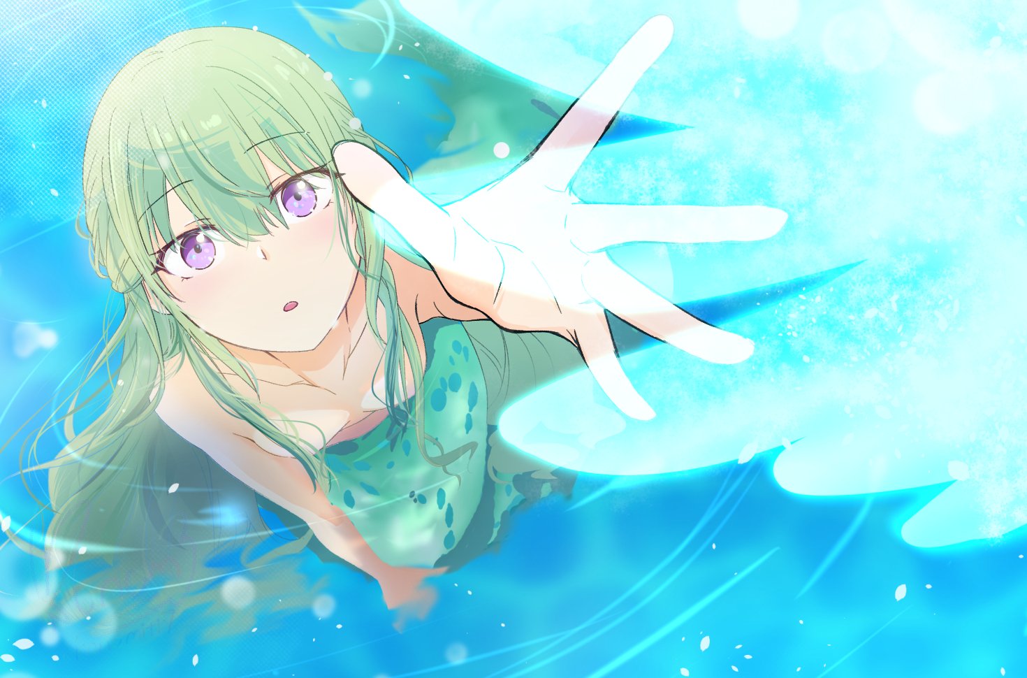 1girlbreastscollarbonefrom abovegreen hairhair between eyeslong hairlooking at viewerno braopen mouthpartially submergedpurple eyessolotopless femalevery long hairwater