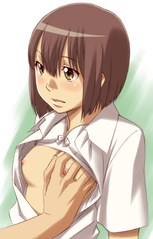 1girlblushbowbrabra liftbreastsbrown eyesbrown hairclothes liftgrabbing another's breastgropinglingerielolinipplesopen clothesopen shirtshirtsmall breastsunderwear