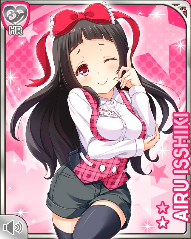 1boy1girlblack shortsblack thighhighsblunt bangsbowbreast restbreastsbrown haircard (medium)character namehair bowlarge breastslong hairlooking at viewername tagone eye closedpink backgroundpink vestplaid clothesplaid vestpointingred bowred eyesshirtshortssmilesolothighhighsthighsvestwhite shirtzettai ryouiki