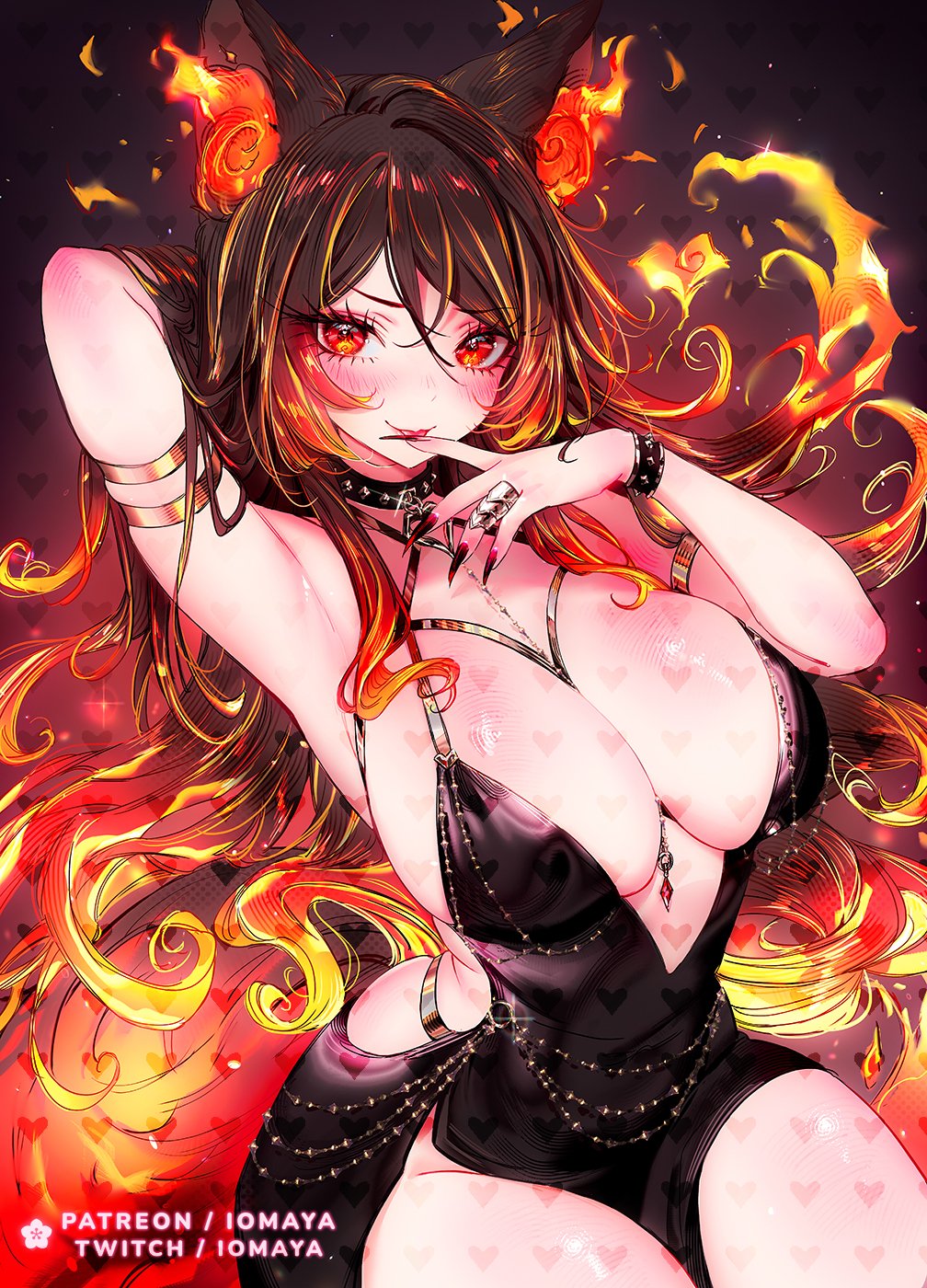 1girlalternate costumeanimal earsarm behind headbare shouldersblack dressblonde hairblushbreastsbrown haircleavagedressfingernailslarge breastslong fingernailslong hairlooking at viewermulticolored hairpatreon usernamered eyesred hairsittingsleevelesssleeveless dresstwitch usernamevery long hairvirtual youtuberwolf ears