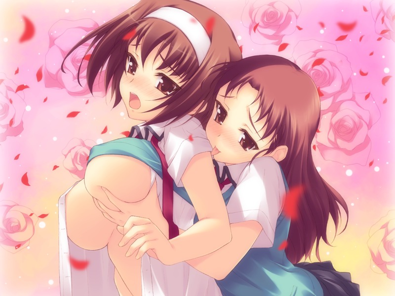 2girlsblushbreastsbrown hairflowergrabbing another's breastgropinghairbandlarge breastslong hairmultiple girlsopen clothesopen shirtpetalsroseschool uniformshirtshort hairtongueunderboobyuri