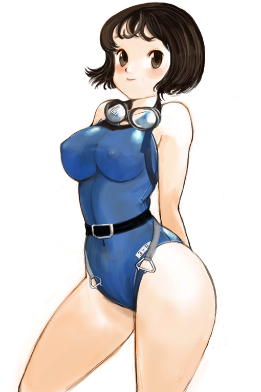 1girlarms behind backbare shouldersbreastsbrown eyesbrown hairfemale focusgoggleslarge breastsone-piece swimsuitshort hairsmilesoloswimsuit